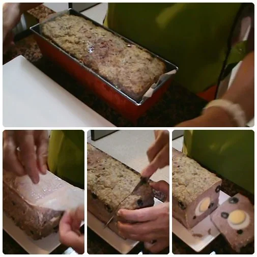 Ponemos una cantidad de nuestro preparado y prensamos con una cuchara y ponemos algunas aceitunas y los huevos duros más o menos a la mitad del molde y cubrimos el total del molde. Tapamos con papel aluminio y ponemos en una bandeja con agua caliente para llevarlo al horno al baño María a 220ºC durante 50 minutos apx.