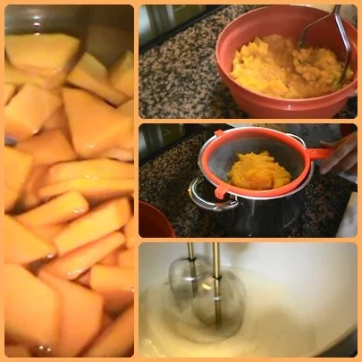 Cocemos la calabaza con agua, escurrimos y chafamos y reservamos.