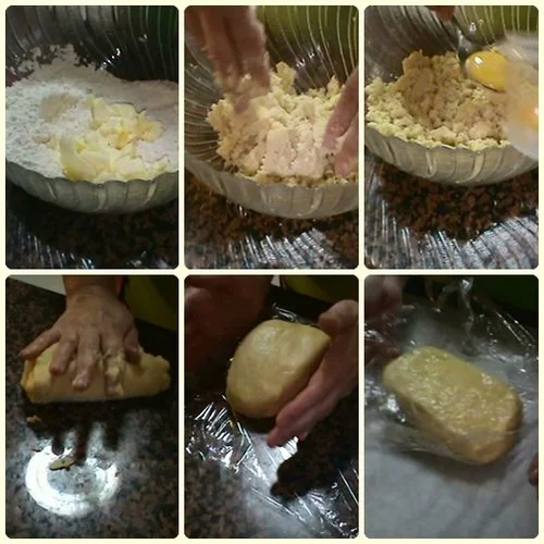 Ahora agregaremos las yemas y el agua fría. Formaremos una masa suave y dejaremos reposar envuelta en film unos veinte minutos.
