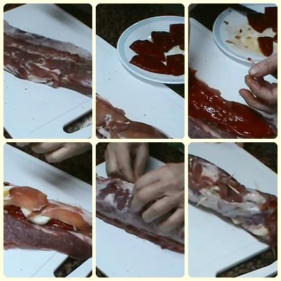 Cogemos el solomillo y lo abrimos por la mitad (o que lo abra el carnicer@) salpimentamos a nuestro gusto sólo por fuera, ponemos en el centro (no cabe mucho) el jamón Serrano, los piquillos cortados y el huevo duro a rodajas.