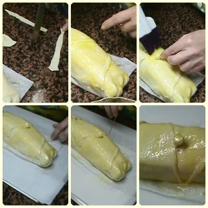 - Al lado de las tiras de adorno, pinchar con un palillo para que no reviente el hojaldre pero que no se vea.