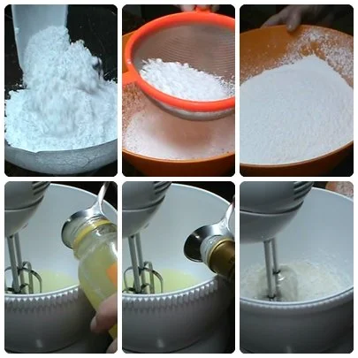 Para hacer la glasa ponemos la clara de huevo en la batidora de varillas y la clara tiene que espumar sin llegar a doblar su volumen ponemos unas gotas de limón y empezamos a poner el azúcar glas a cucharadas hasta que se haga una pasta como la de dientes, esa dicen que es la textura que debe de quedar.