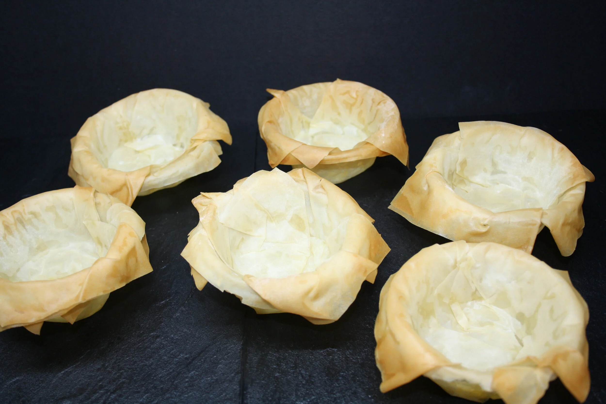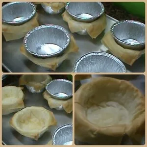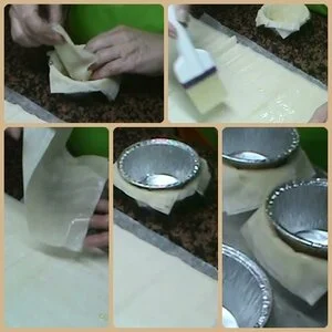 Cortamos la lamina de pasta filo en cuatro partes, la mantequilla la derretimos en el microondas, vamos pincelando de mantequilla lo que es el cuadrado de la cuarta parte de la hoja que doblamos por la mitad y acomodamos en la flanera de aluminio.