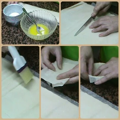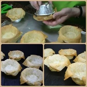 Esta operación la vamos realizando como tres veces y acomodamos cambiando la posición de los picos de la pasta filo en la flanera,