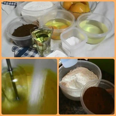 Si tenéis máquina con varillas o a mano ponemos los huevos en el bol y llevamos a que espumen o clareen añadiendo el azúcar y el aceite sin dejar de batir, añadimos el almíbar lo integramos. Mezclamos la harina con la levadura química y el cacao tamizados en dos o tres veces y lo integramos todo añadimos la pizca de sal.