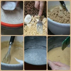 añadiendo los polvorones que chafamos con un tenedor, tamizo la harina con la levadura química o polvo de hornear , mezclamos que se integre todo y la pizca de sal que no se olvide y el bicarbonato.