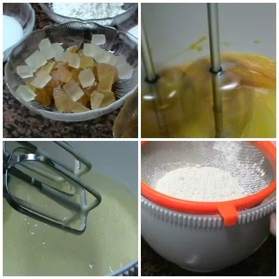 Le añadimos las frutas escarchadas a trocitos o como os guste. Preparamos el molde para plum cake con un poco de mantequilla o aceite y un papel horno que nos ayudará a desmoldar.