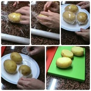 Las ponemos en el microondas unos dos minutos aproximadamente por patata. al sacarlas las dejamos enfriar mínimamente para retirar el papel film sin quemarnos.