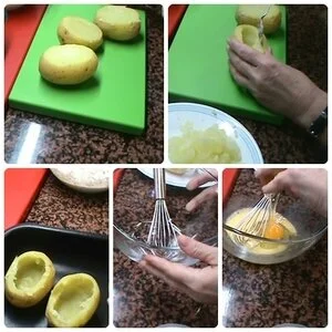 Vamos a quitar un poco de la patata por la parte que más nos guste y con una cuchara o un saca bolas las vaciamos y ponemos en una fuente para horno.