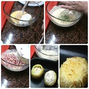 Añadimos las hierbas aromáticas, añadimos el requesón y el beicon a trocitos, batimos todo junto que se integre. Rellenamos las patatas, las cubrimos con el queso rallado para fundir y las ponemos al horno que tendremos precalentado a unos 200ºC aproximadamente calor arriba y abajo hasta que veamos que se funde el queso a nuestro gusto yo las tengo unos 12-15 minutos aproximadamente.
