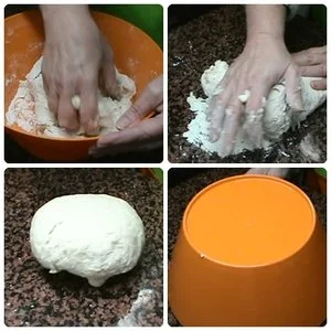Amasamos y hacemos una bola y dejamos tapada con el bol mientras preparamos la bandeja del horno con papel vegetal. El horno lo tendremos precalentado a 220ºC aprox. con aire.