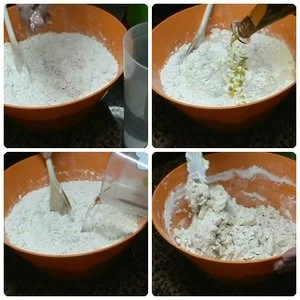 ponemos las harinas en un bol y las mezclamos, podéis disolver la levadura en el agua templada mínimamente o deshacerla en las harinas. Añadimos y mezclamos y empezamos a amasar, ponemos el aceite y lo ultimo la sal.