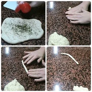 Ahora estiramos un poco la masa y le integramos el ajo y el perejil volviendo a amasar que se integre todo bien. Formando otra vez una bola. vamos cogiendo pellizcos de la masa que no necesita más reposo y hacemos los palitos rodando en la mesa de trabajo, si veis que se pegan untaros las manos con un poco de aceite.