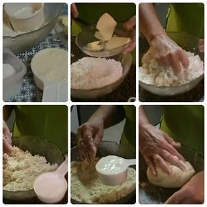 En un bol ponemos la harina tamizada y las dos pizcas de sal removemos, añadimos la mantequilla que esté fría, a trocitos y vamos amasando haciendo una especie de tierra, quedara como la arena de la playa húmeda, añadimos el azúcar y vamos integrando, la nata y seguimos integrando todo con las manos hasta formar una bola.