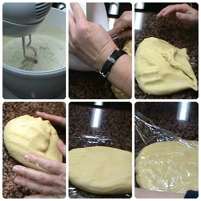Vamos poniendo la harina hasta que se integra todo y se hace una masa. Sacamos del bol y amasamos un poco a mano hacemos bola o rectángulo envolvemos en film y guardamos en el frigo una hora como mínimo.