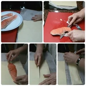 Lo primero y muy importante limpiar los dos filetes de salmón le quitamos la piel y que no queden espinas.