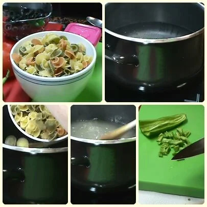 En primer lugar pongo como 100 grs. aprx. por persona de pasta seca. La ponemos en abundante agua y sal a cocer y seguimos el tiempo de cocción del paquete, es mejor dejar la pasta al dente pero esto cada uno que la cueza a su gusto.
