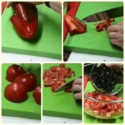 Mientras se cuece la pasta en un bol vamos poniendo Pimiento verde, pimiento rojo y tomate cortados a cuadraditos o a vuestro gusto.