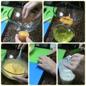 Separamos las claras de las yemas y las mezclamos sin batir mucho con el azúcar y reservamos.
