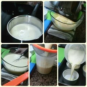 Mientras ponemos la nata con la leche al fuego y le añadiremos la vaina de vainilla abierta y rascándola para sacarle el interior que uniremos al fuego hasta que comience a hervir removiendo que no se queme y colaremos cuando pierda algo de calor a las yemas con el azúcar que tenemos preparadas. una vez que tenemos todo unido mejor colarlo para quitar las impurezas de las yemas.
