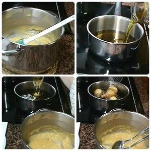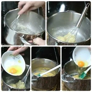 Cuando comienza a hervir añadiremos la harina que tenemos previamente tamizada y removeremos hasta formar una bola y retiraremos del fuego. Dejaremos un poco y vamos añadiendo un huevo y que se integre totalmente a la masa, iremos añadiendo de uno en uno, cada huevo debe estar integrado antes de añadir el siguiente.