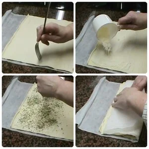 Estiramos la lamina de hojaldre y la pinchamos con un tenedor. Solo ponemos los ingredientes en la mitad del hojaldre. Primero ponemos el queso y las hierbas aromáticas. Luego doblaremos a la mitad el hojaldre.