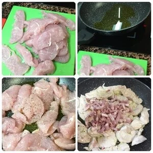 En una sartén ponemos un poco de aceite, troceamos el pavo a nuestro gusto, sal pimentamos, lo rehogamos añadiremos el beicon dándole unas vueltas