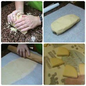 Yo estiro la masa con el rodillo lo pongo en bandeja de hornear tapadas con papel de horno en el frigo Mejor una hora que media. Cuando la masa está fría hacemos las formas y las horneamos o volvemos a dejar un rato en el frigorífico para que no se deformen y ya las podremos hornear.