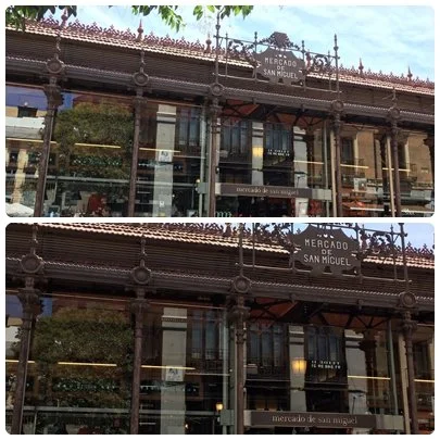 Ahora solo os hablaré del famoso Mercado San Miguel, de Madrid, al que fui dos veces y me fue imposible tomar nada, eso estaba abarrotado, la gente tenia que comer el bocata o el pincho en la calle, aunque hay sitio para sentarse era imposible, así que solo vi que esta muy chulo que hay varias ofertas muy interesantes para tomar, pero como soy muy cómoda me gusta sentarme cuando voy a tomar algo como aquí que podría ser un aperitivo me tuve que recorrer el mercado un poco a empujones y solo saque la foto del exterior. Espero que en otra ocasión pueda volver.