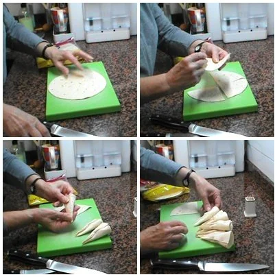 Partimos las tortillitas en cuatro y hacemos unos cucuruchos y lo sujetamos con un palillo.