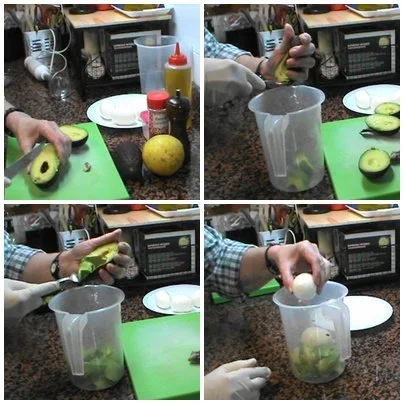 Cortamos a la mitad los aguacates y quitamos el hueso, ponemos el interior sin piel en una jarra o bol, añadiremos los huevos duros.