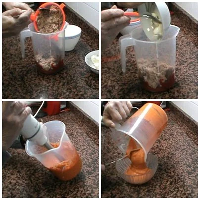 Lo primero es abrir los piquillos y quitarles las semillas, lo ponemos en un recipiente para luego triturar. Añadiremos las anchoas, yo las he pasado por agua y las he dejado escurrir en un colador por quitarles algo de sal.