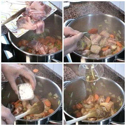 Cuando tenemos las verduras pochadas añadiremos los trozos de cordero rehogaremos y añadiremos el pimentón lo movemos que no se queme, añadiremos la harina y movemos que no se queme pero que se cocine. Ahora añadiremos el brandy y dejaremos que evapore un poco., moviendo el fondo para que no se agarre nada.