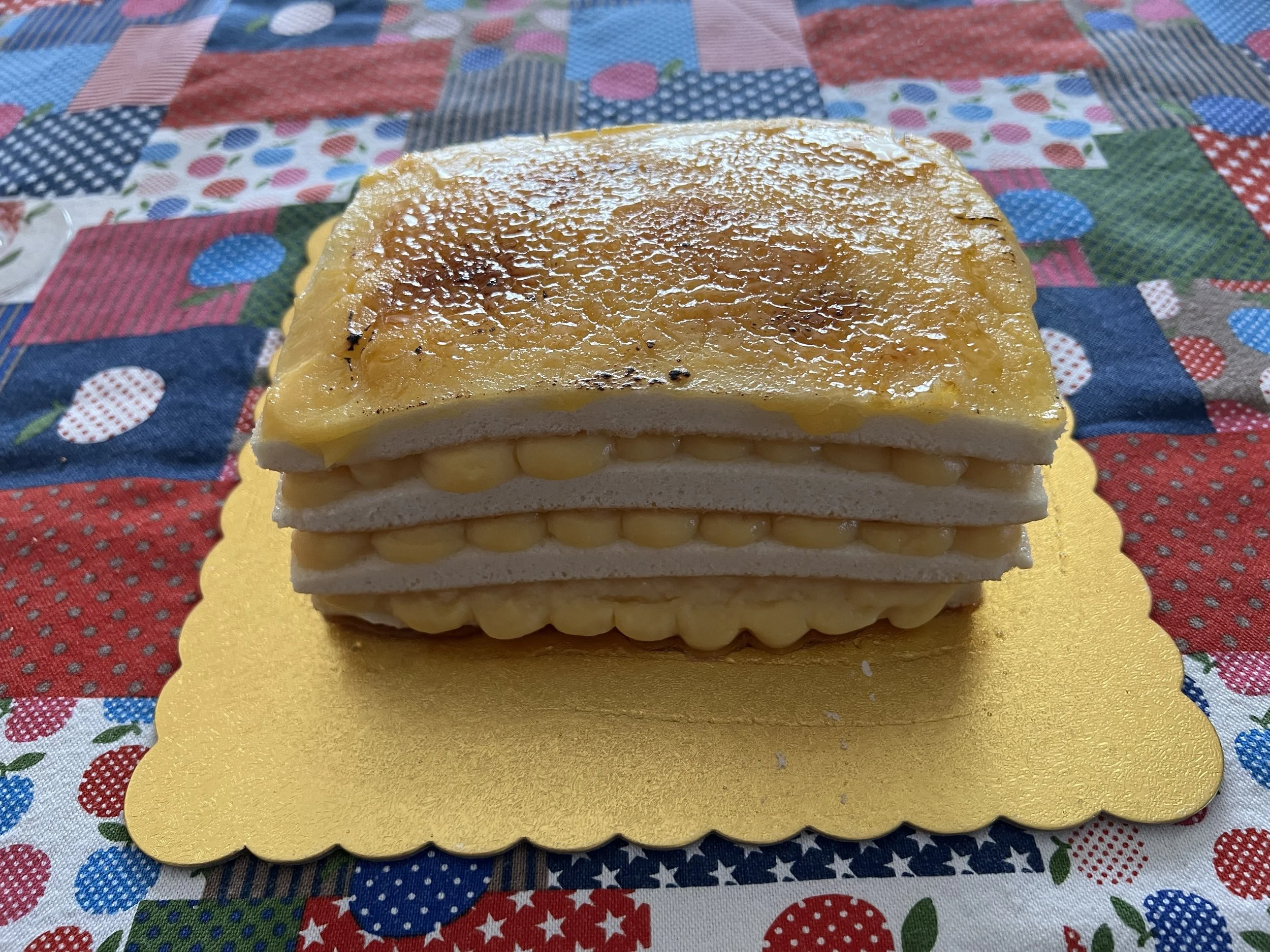 El ultimo ya no quedamas mucha crema pastelera asi que la extiendo y añado azúcar y con el soplete la intento quemar. No me quedaba gas y cuando me lo trajeron ya tenia la tarta en el frigo y al volver añadir azúcar no quemaba muy bien. Pero de sabor quedo rica