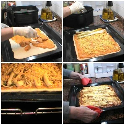 El horno lo tenemos precalentado y lo ponemos a 200ºC calor arriba y abajo con o sin aire. Durante 15-20 minutos todo dependerá del grosor de la masa.