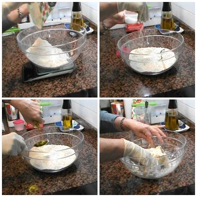 Pesamos la harina preparada, añadimos la sal el aceite y el agua templada, mezclamos.