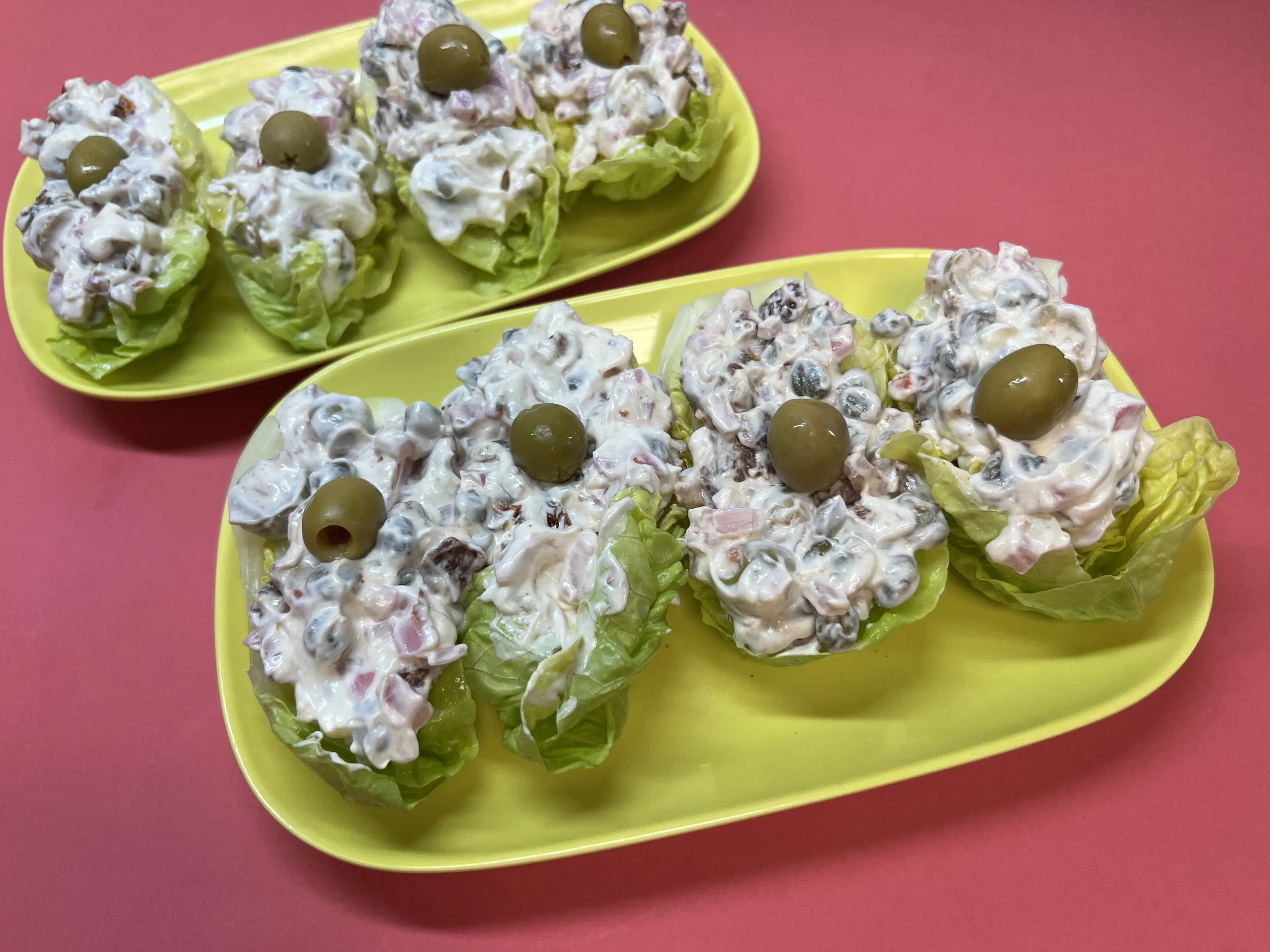 Tenemos los cogollos bien lavados y escurridos y secos. Les damos un toque de aceite y sal y vamos poniendo el relleno encima y lo terminamos con una aceituna rellena de pimiento. Nos queda un entrante estupendo para cualquier día del año.