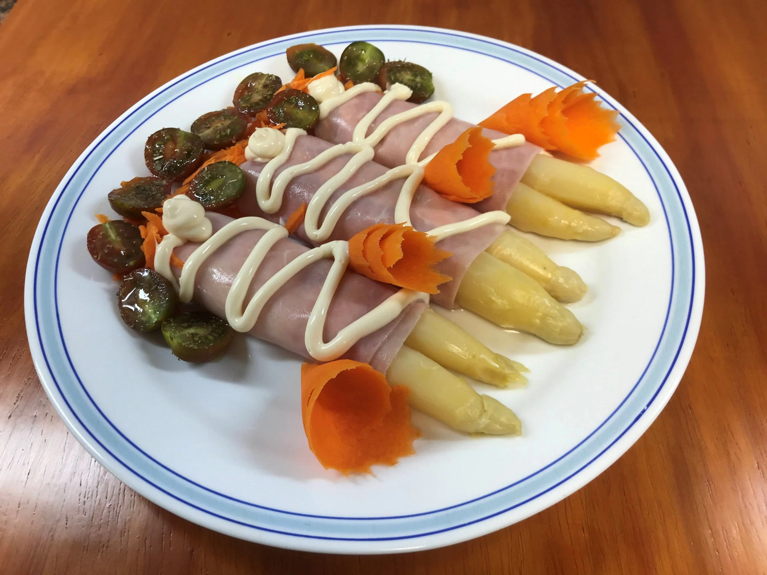 Ponemos un poco de mayonesa en la loncha de jamón cocido ponemos los espárragos en este caso como son gruesos pongo 2